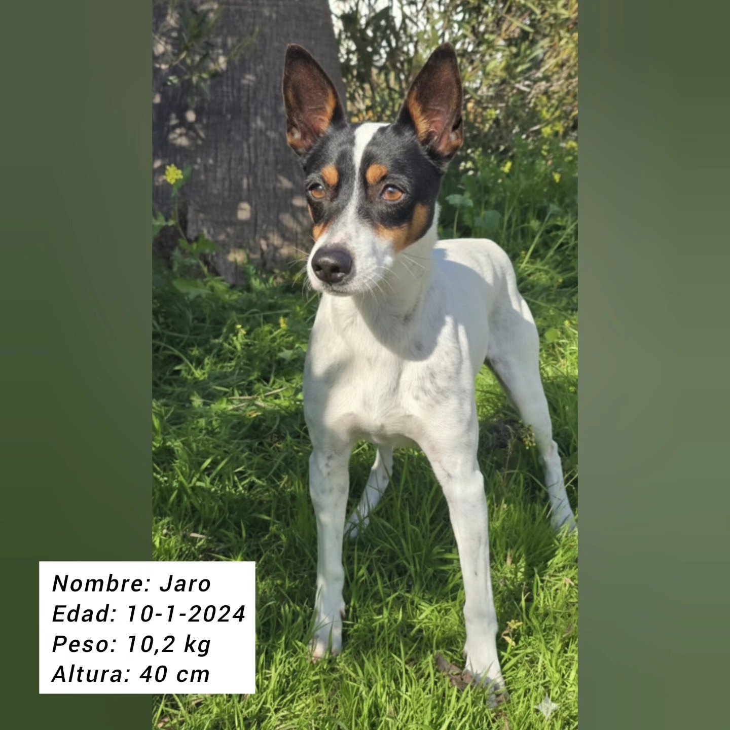 Jaro ist ein junger Bodeguero-Rüde, der erst seit kurzer Zeit in einem spanischen Tierheim lebt. Die neue Situation verunsichert ihn noch ein wenig – deshalb zeigt er sich anfangs etwas schüchtern. Doch wer ihm einen Moment Zeit schenkt, wird schnell belohnt: Hat Jaro erst Vertrauen gefasst, entpuppt er sich als ausgesprochen liebevoller, zutraulicher und freundlicher Hund, der die Nähe zu Menschen sehr genießt.