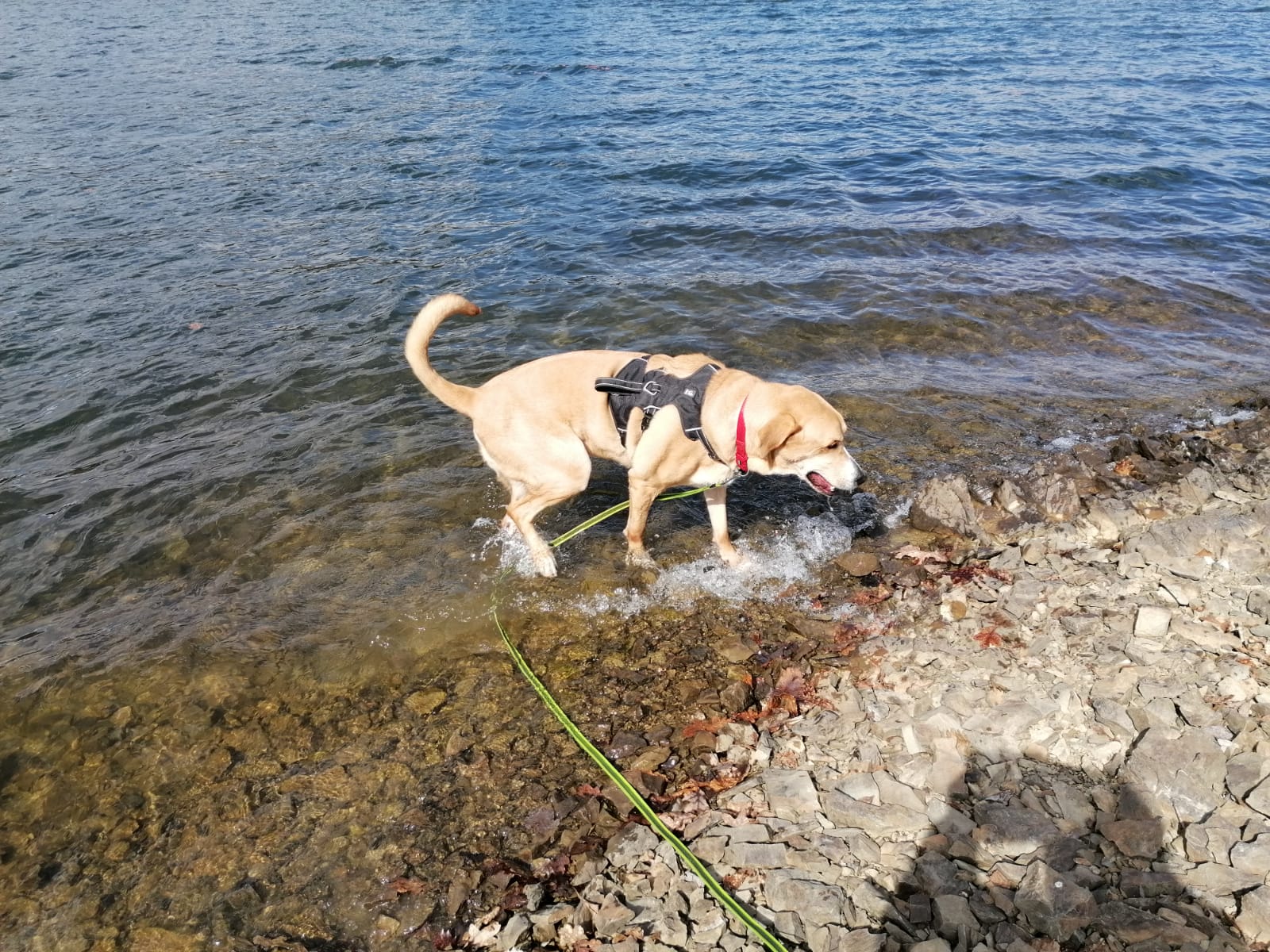 Im Auto fährt er sehr gerne mit, allerdings fällt ihm das Hineinspringen aufgrund der fehlenden Kraft in den Hinterbeinen nicht immer leicht.
