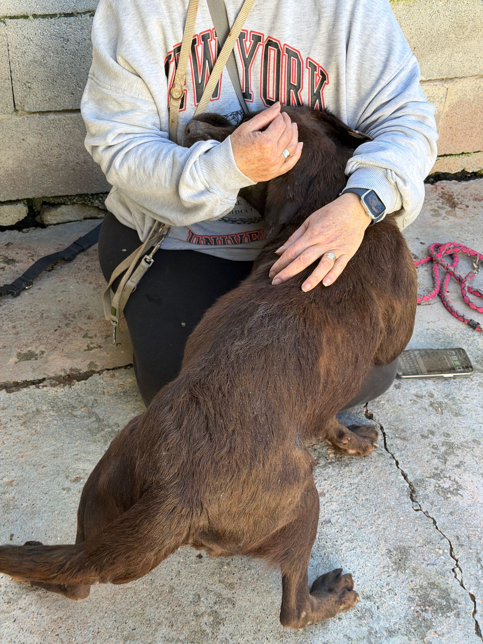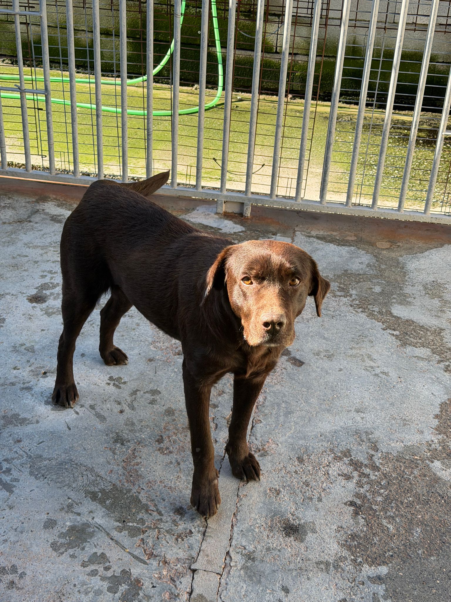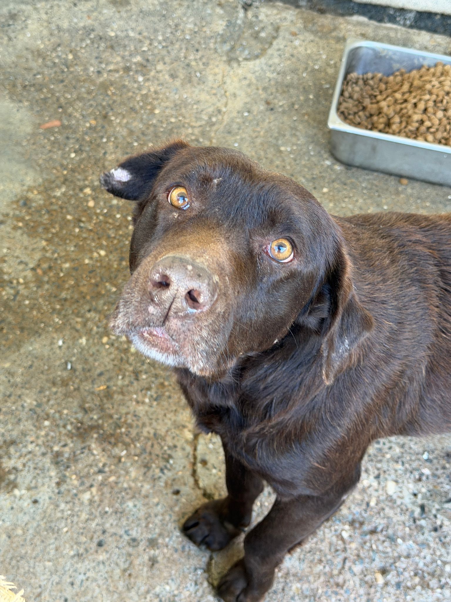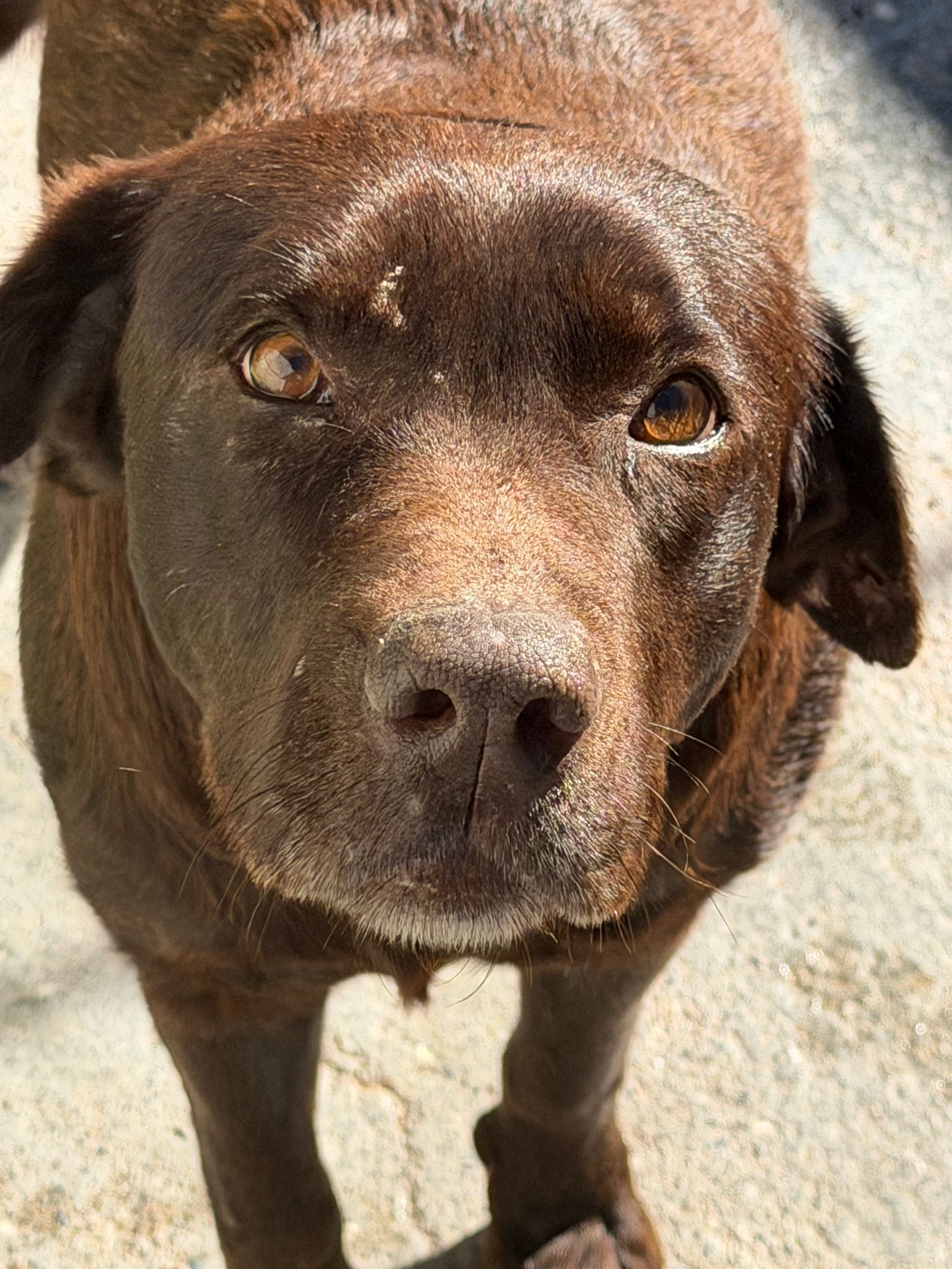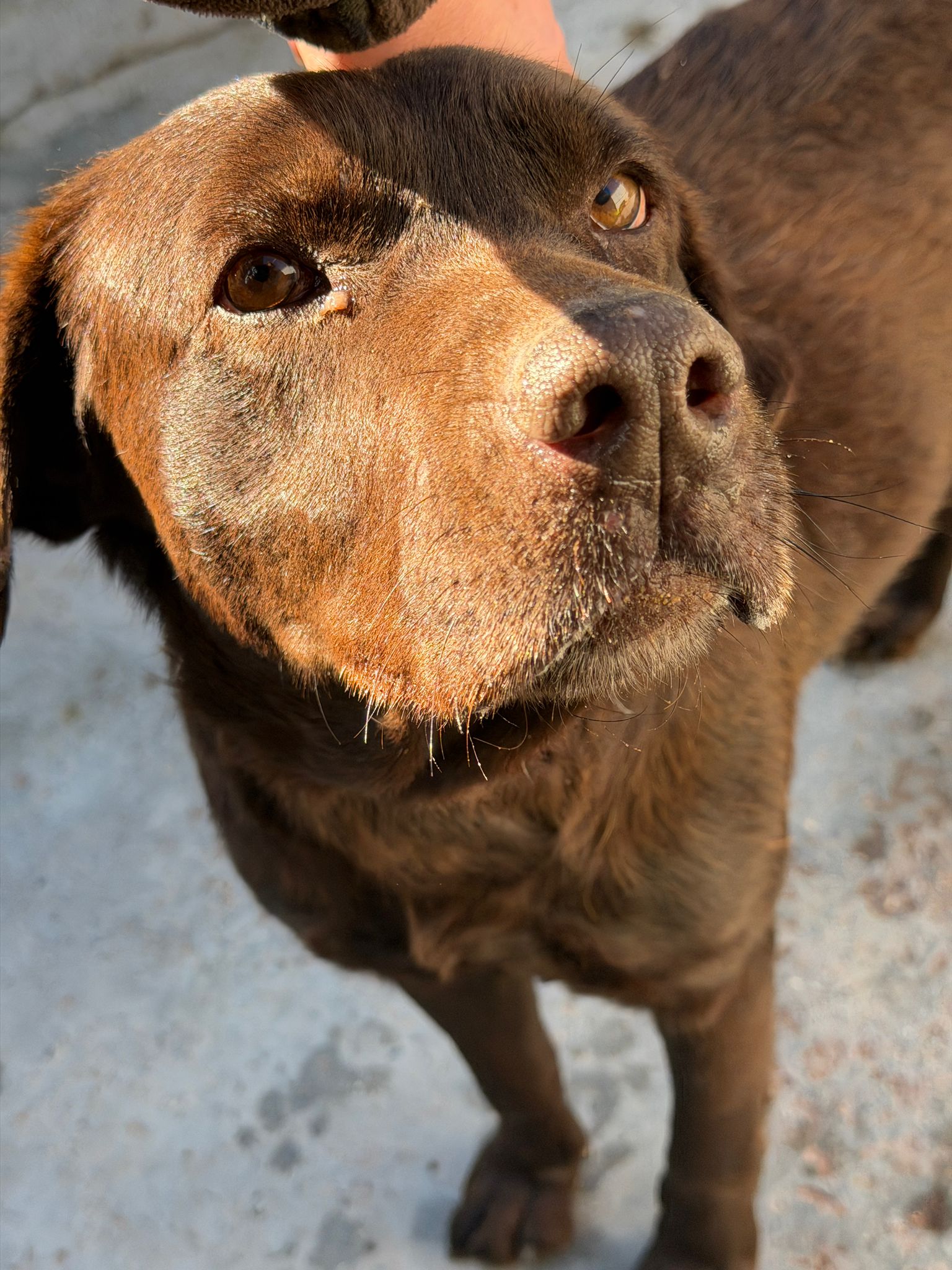 Mit ihrer warmen, schokobraunen Fellfarbe, ihrem weichen Blick und ihrer ruhigen Ausstrahlung ist Mika eine Hündin, die man anschaut – und unwillkürlich ins Herz schließt.