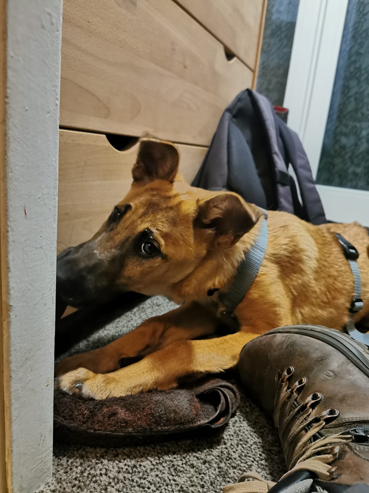 Stubenrein bleiben klappt schon soweit gut, wenn mit Vorbeugung gearbeitet wird. Autofahren meistert er super – er fährt entspannt in seiner Box mit und fühlt sich dort sicher. Neue Situationen geht Armin aufmerksam und interessiert an. Fremden Menschen begegnet er zunächst zurückhaltend, dabei aber ruhig und ohne Angst. Sogar seine erste Busfahrt hat er bereits erleben dürfen. Er übt fleißig an seiner Leinenführigkeit und zu seinen Erfolgen gehört, dass er sich schon deutlich seltener verheddert… Ach, die Herausforderungen im Leben eines Junghundes.