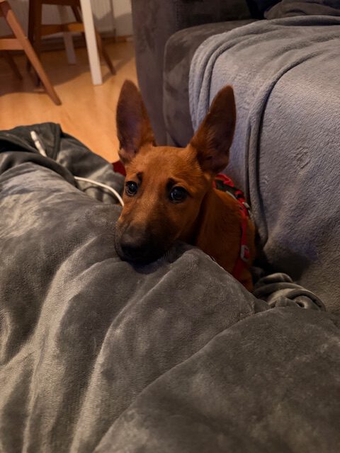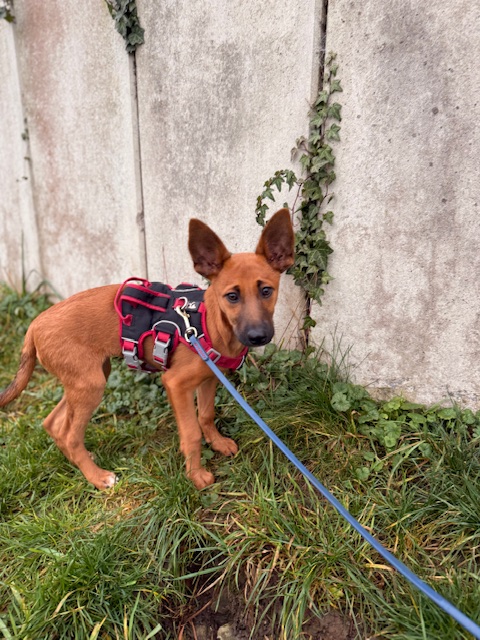Als junger Podenco-Malinois-Mix bringt Hange wahrscheinlich neben Sensibilität auch besondere Intelligenz und Lernfähigkeit mit. Wir glauben, dass aus Hange ein sehr bewegungsfreudiger, aktiver Hund werden wird, und wünschen uns für sie ein Zuhause, das sich darüber im Klaren ist und sie auf ihrem Energielevel treffen kann.