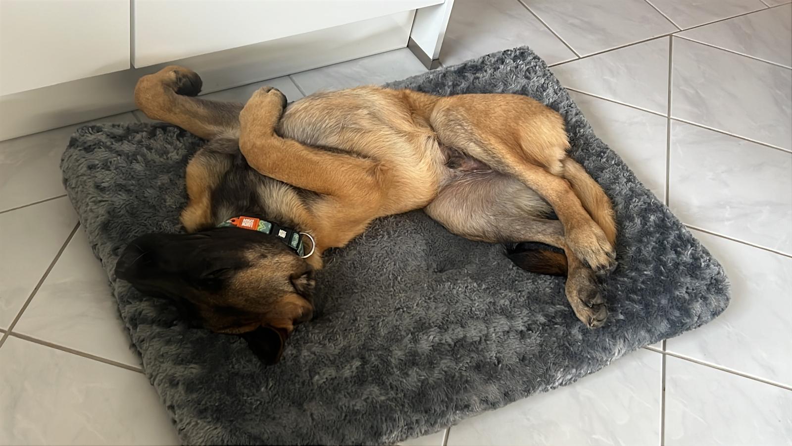 Stubenreinheit? Check. Alleinbleiben? Klappt im Kennel schon richtig gut. Zur Ruhe kommen? Für einen so jungen Hund bereits erstaunlich souverän.