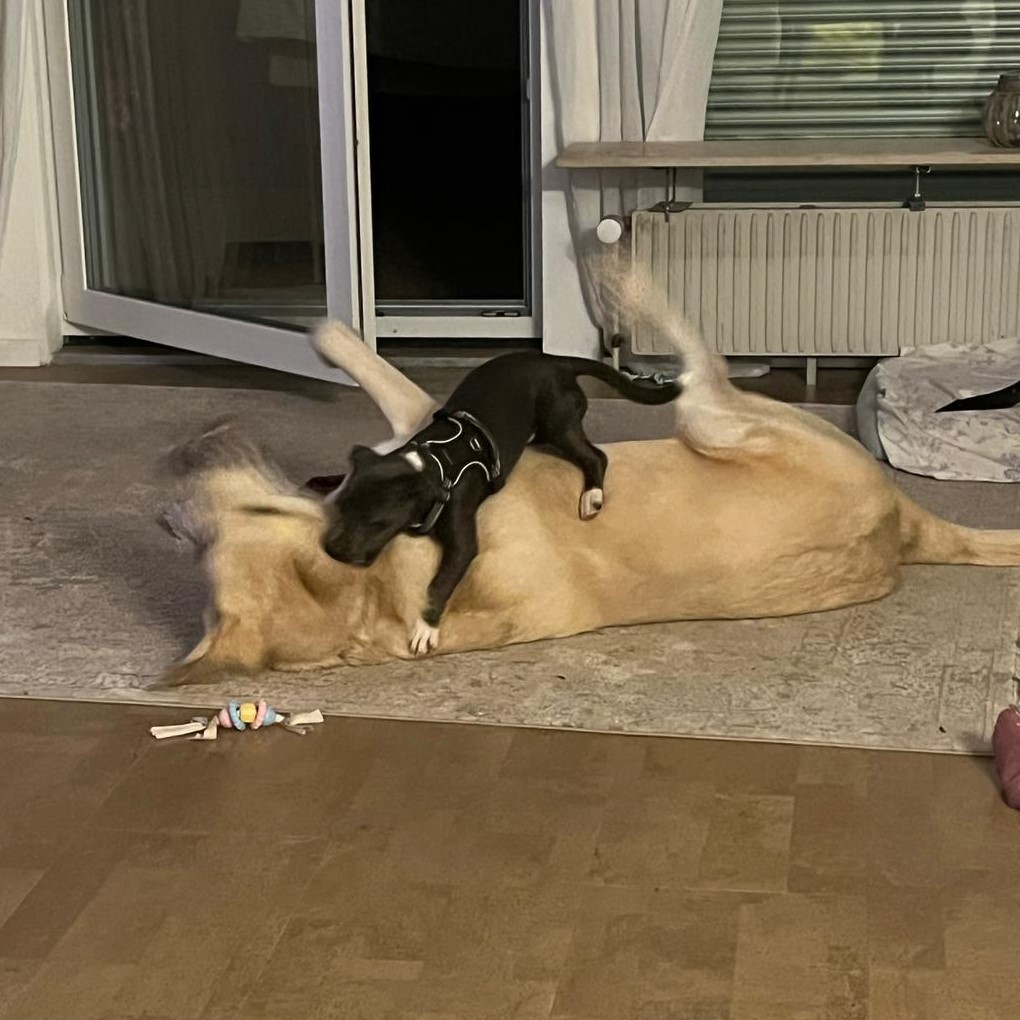 Bei fremden Hunden entscheidet bei Gandalf die Sympathie, andere Hunde sollten nicht zu aufgeregt und aufdringlich sein, das mag er nämlich nicht. Er ist, wenn die Sympathie stimmt, sehr verspielt, Zerrspiele vor allem, erfreuen sein Herz.