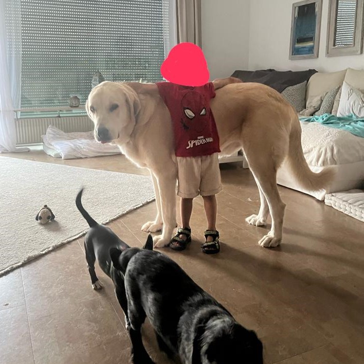 Mit Kindern ist der große Rüde phantastisch und sanft. Ländlich soll sein neues Zuhause sein, solch ein Hund gehört nicht in die Großstadt. Auf seiner Pflegestelle, kennt er Katzen, Meerschweinchen, Hühner und Pferde. Seinen „eigenen“ Tieren tut er absolut nichts, einer fremden Katze auf dem Grundstück geht er durchaus hinterher.