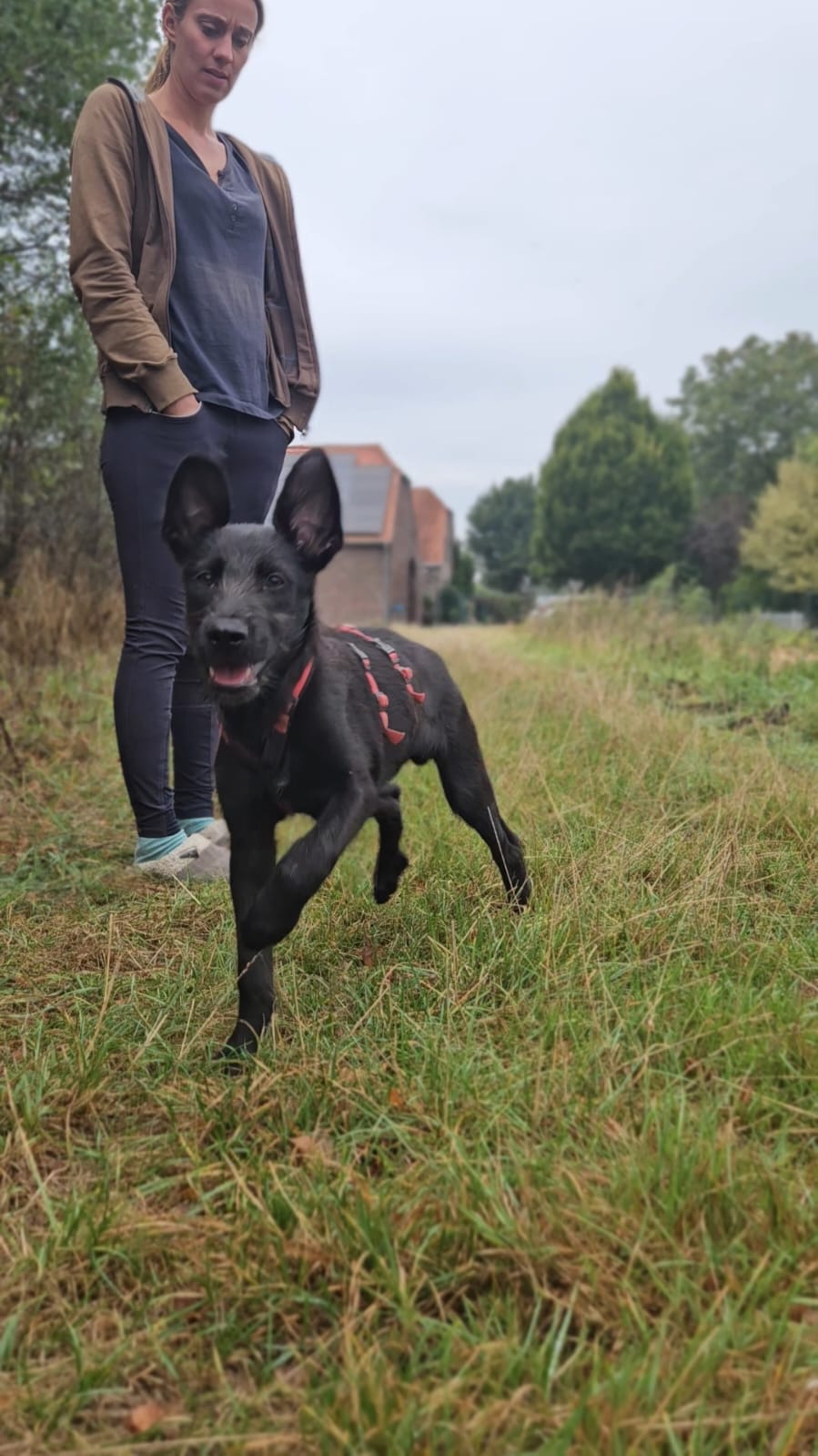 Auf seiner Pflegestelle begegnet er dem Leben offen und unerschrocken: Pferde, Hühner, Katzen, andere Hunde, Kinder – all das meistert er mit Neugier und Freude.