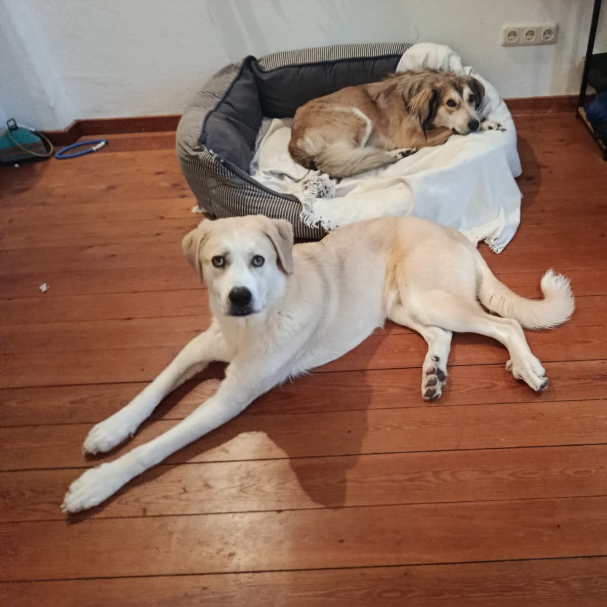 Draußen zeigt er seine fröhliche, neugierige Seite: Spaziergänge liebt er über alles und erkundet seine Umgebung aufmerksam und interessiert. Mit anderen Hunden versteht er sich sehr gut – sogar die eher „kritischen“ Typen finden ihn sympathisch. Beim Spielen ist er begeistert dabei, manchmal etwas übermütig, aber stets freundlich. Snowy liebt das Leben und alle Lebewesen. Er begegnet Menschen offen und freundlich, kommt mittlerweile sogar bei Besuch mit in den Garten und genießt das Miteinander sichtbar. Ein Herdenschutzeinschlag ist denkbar, zeigt sich aber bisher kaum.