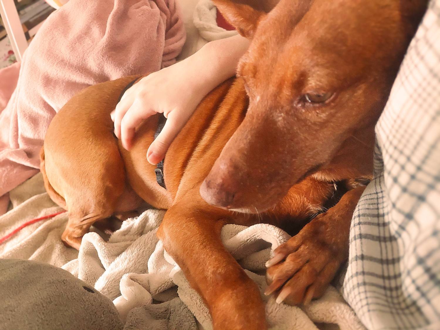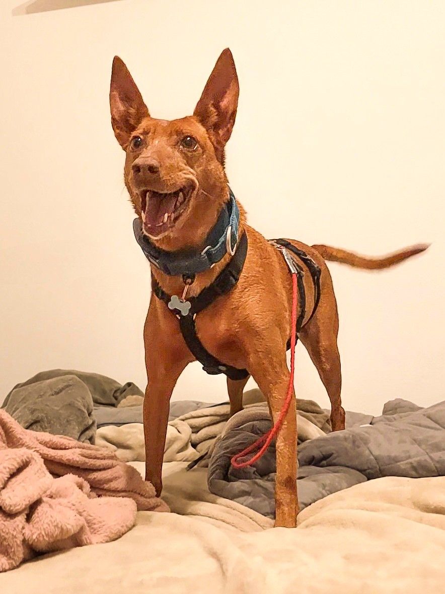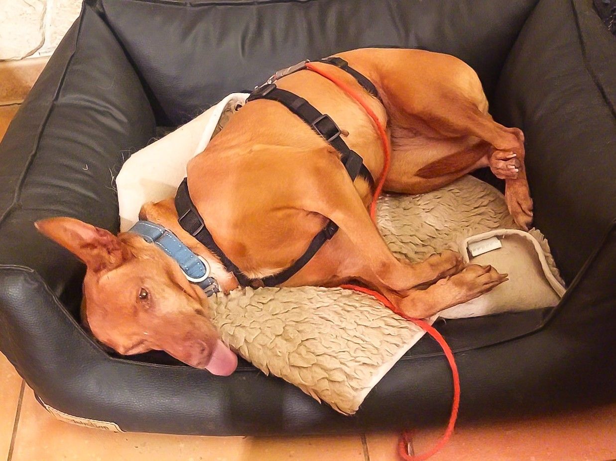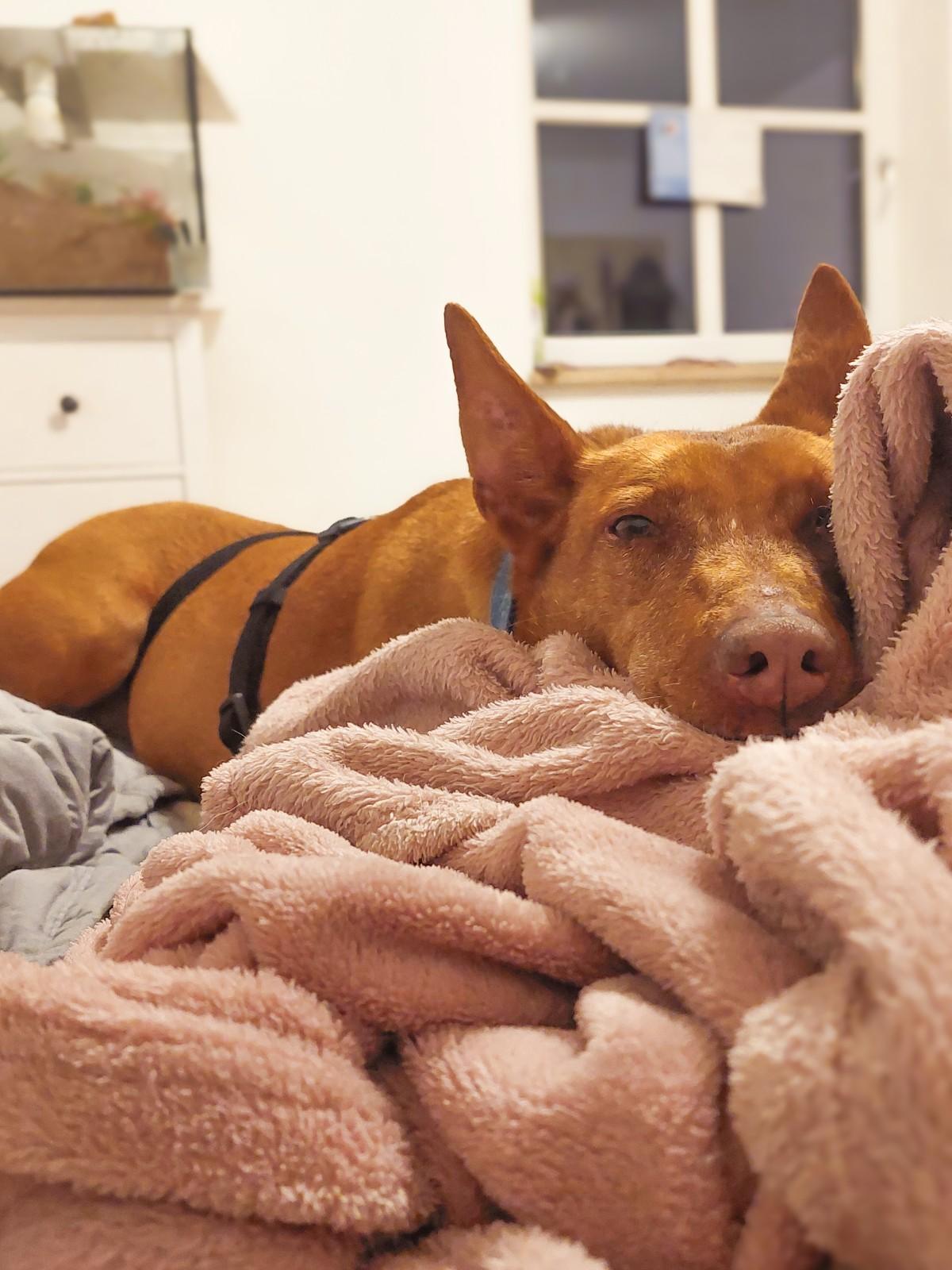 Tagsüber döst sie gerne in ihrem Körbchen, sie würde sich daher bestimmt auch gut als Bürohund eignen. Wird sie aufs Sofa eingeladen, lässt sie sich liebend gerne kraulen und bittet, wenn man aufhört auch mit sanften Pfötchen um Nachschub, wird dabei aber nie aufdringlich oder gar grob. Momentan ist sie ziemlich stämmig, das Fuchsgesicht und die zarten Beine lassen unter den Winterpolstern jedoch einen eleganten Körperbau erahnen. Da Spaziergänge mit ihr für beide Seiten sehr angenehm und stressfrei sind, wird das Abnehmen sicherlich kein Problem werden. Lima läuft an der lockeren Leine und mit wedelnder Rute neben ihrer Bezugsperson her. Der podencotypische Jagdtrieb hat sich bisher als nicht besonders ausgeprägt gezeigt, selbst wegrennenden Katzen schaut sie lediglich mit leichtem Interesse hinterher.