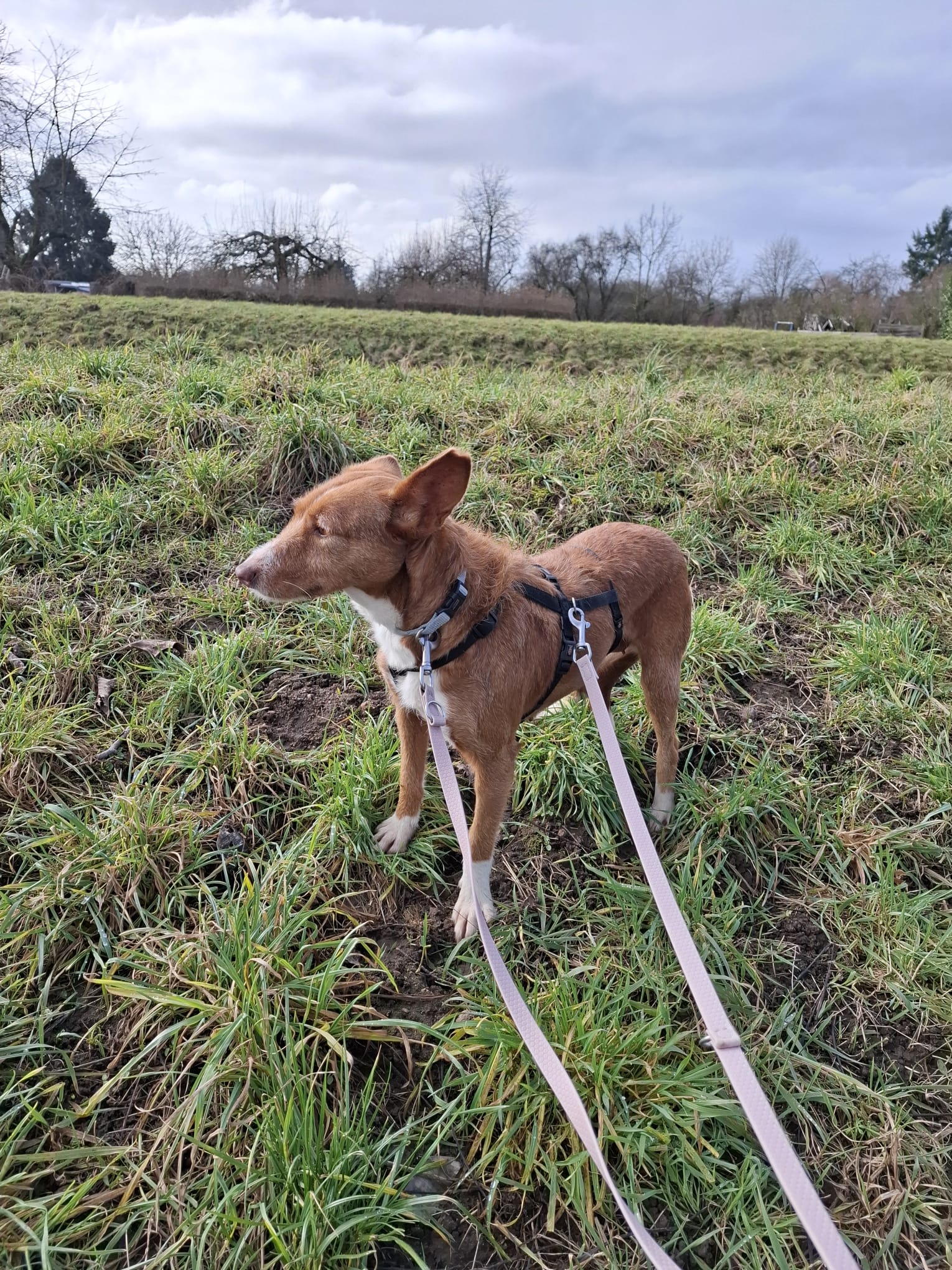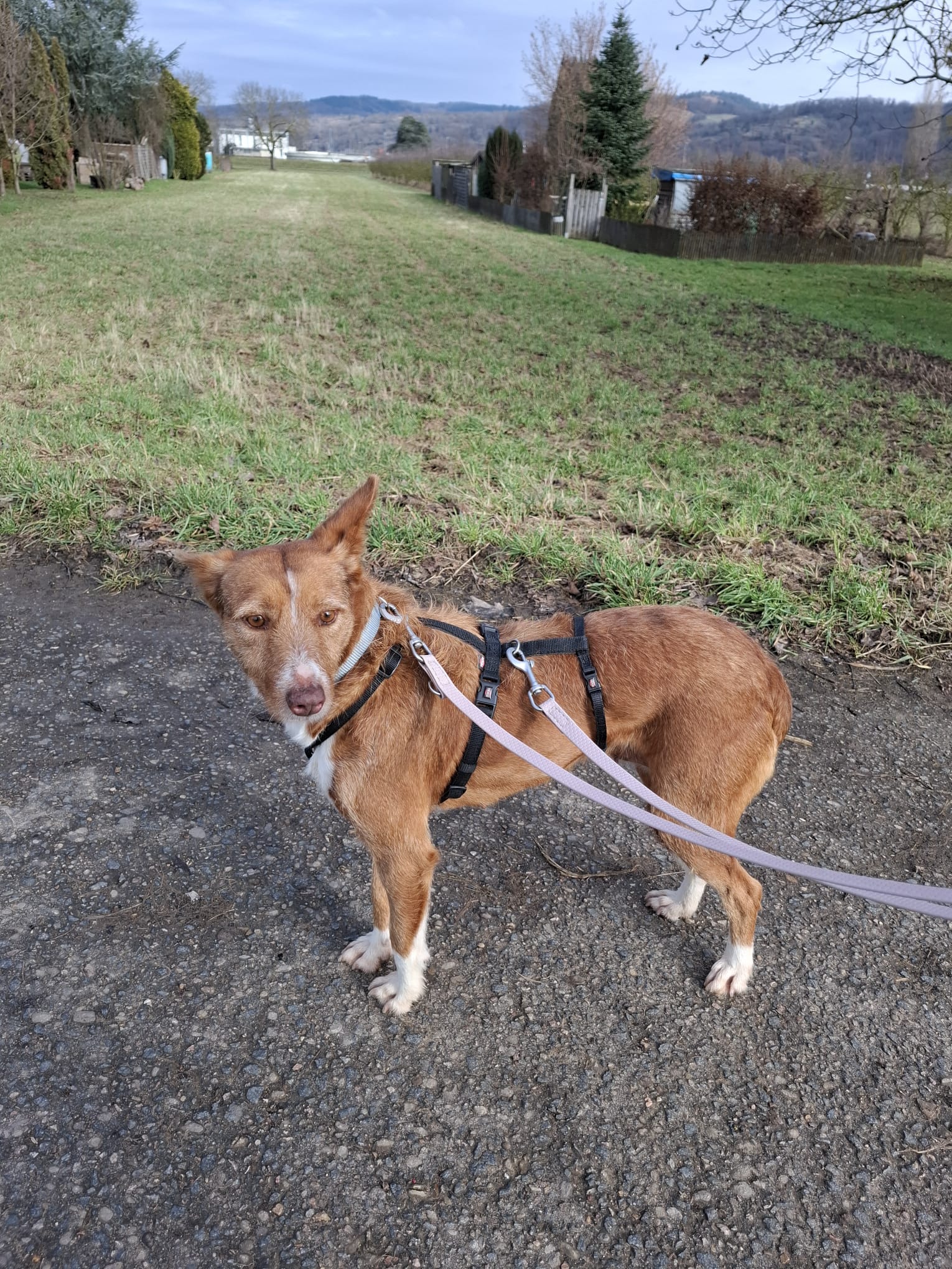 Schnell hat Mona vor allem die täglichen Spaziergänge lieben gelernt. Hier ist sie eine fröhliche Begleiterin, auch auf größeren Runden und freut sich über jeden Hundekontakt. An der Leine läuft sie sehr fein. Allerdings weicht sie noch zurück, wenn fremde Menschen auf sie zulaufen. Mit unserem jungen Rüden und den Katzen kommt Mona sehr gut zurecht und bleibt in dieser Konstellation auch problemlos eine angemessene Zeit allein. Auch wenn Mona bei uns mit einem Kleinkind zusammen lebt, würde sie von einem ruhigeren Haushalt mit älteren Kindern sicherlich profitieren.“