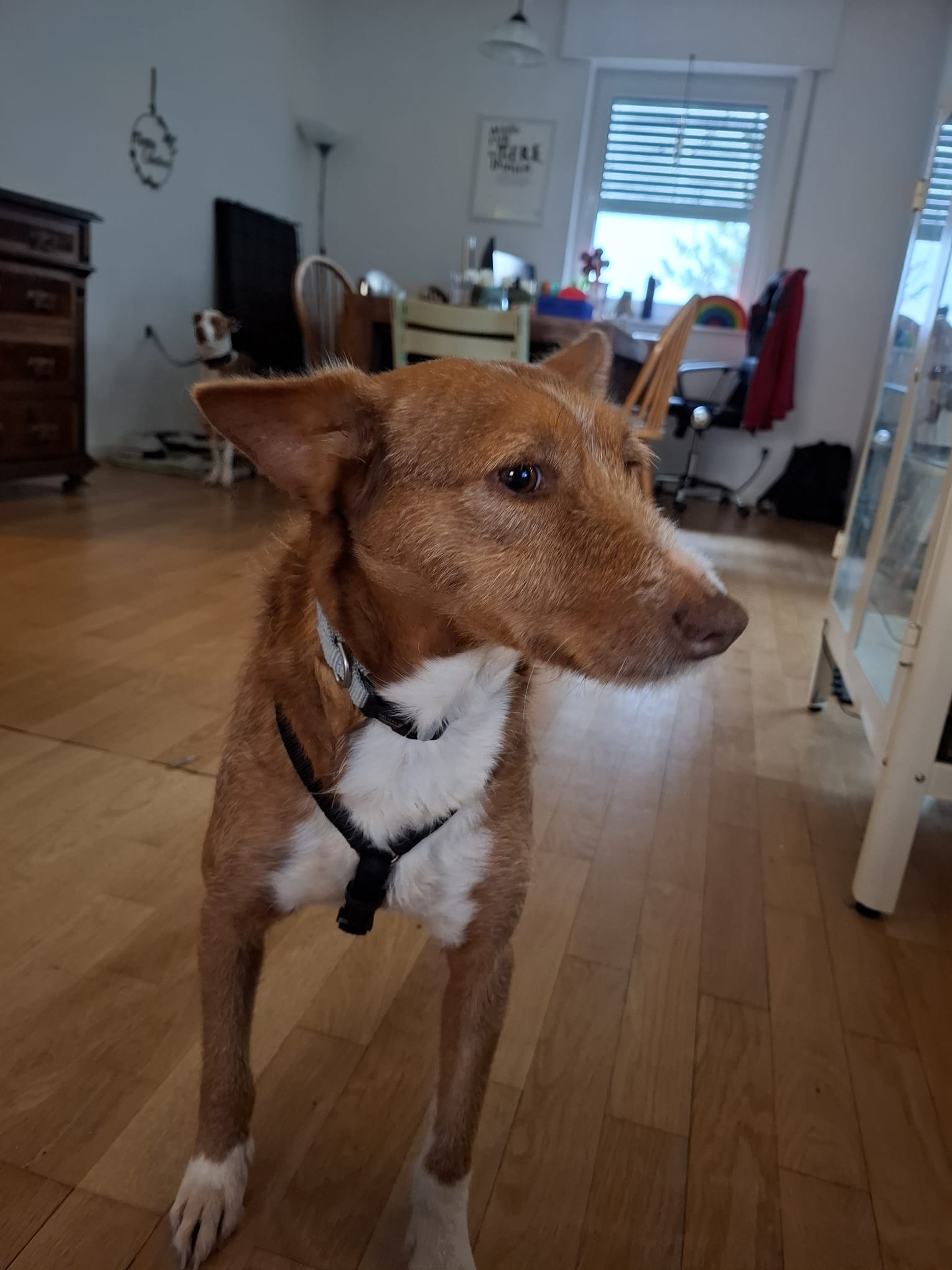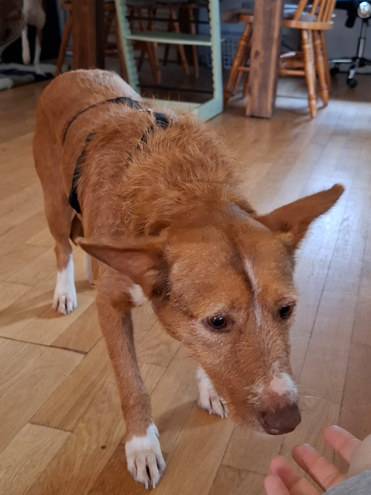„Mona ist nun seit einiger Zeit bei uns und hat sich inzwischen an die Routinen und Abläufe im Alltag gewöhnt. Bereits seit dem ersten Tag ist die hübsche, rauhaarige Podenca absolut zuverlässig stubenrein. Mona war anfänglich sehr unsicher und zeigt auch heute noch Unsicherheiten bei schnellen Bewegungen oder wenn man sich zu ihr herunter beugt. Insgesamt ist sie aber stets neugierig und sucht Kontakt, wenn man sich zu ihr setzt oder ihr Zeit lässt. Alltagsgeräusche wie Staubsauger und Föhn kennt sie inzwischen, auch wenn sie auf ersteres gern verzichten könnte. Hier zieht sie sich dann lieber auf ihren Platz zurück, bis der Staubsauger wieder im Schrank verschwindet.