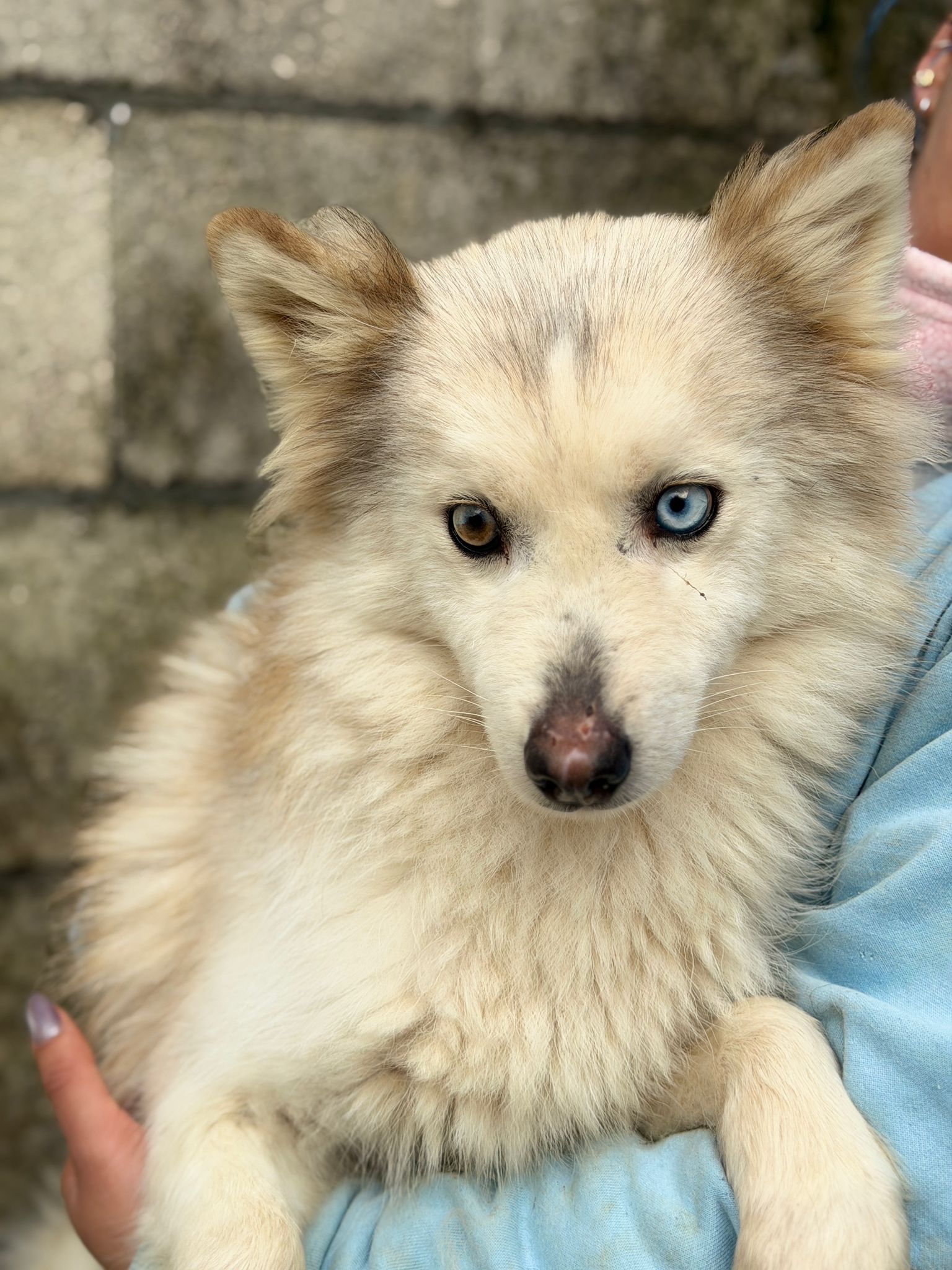 Trotz ihrer Zurückhaltung lässt sich Melania bereits vorsichtig anfassen, was zeigt, dass sie grundsätzlich offen für den Kontakt zu Menschen ist. Mit Geduld, liebevoller Zuwendung und einem ruhigen Umfeld wird sie Schritt für Schritt auftauen und lernen, Vertrauen zu fassen. Als Pomsky – eine Mischung aus Husky und Pomeranian – bringt sie Intelligenz, Aufmerksamkeit und eine enge Bindung an ihre Menschen mit. Hat sie erst einmal Vertrauen gefasst, wird sie sich sicherlich zu einer treuen und liebevollen Begleiterin entwickeln. Für Melania wünschen wir uns ein verständnisvolles Zuhause mit viel Geduld und Herz. Ein souveräner Ersthund wäre dabei von großem Vorteil, da sie sich an ihm orientieren und von ihm lernen könnte. So hätte sie einen sicheren Partner an ihrer Seite, der ihr hilft, Schritt für Schritt mutiger zu werden und die Welt zu entdecken.