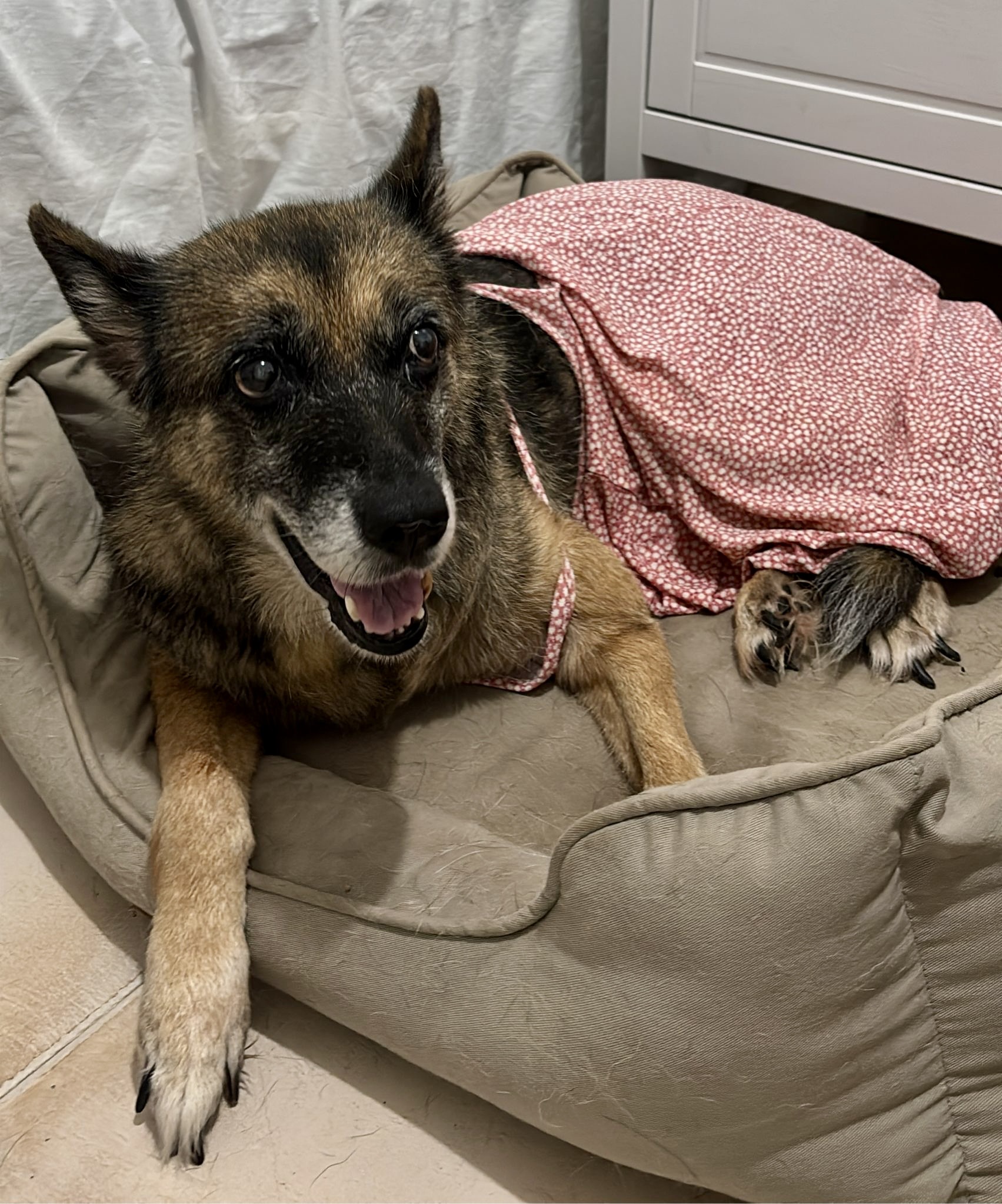Die 14 jährige Schäferhündin kam im Juni 2025 in desolatem Zustand ins Tierheim.