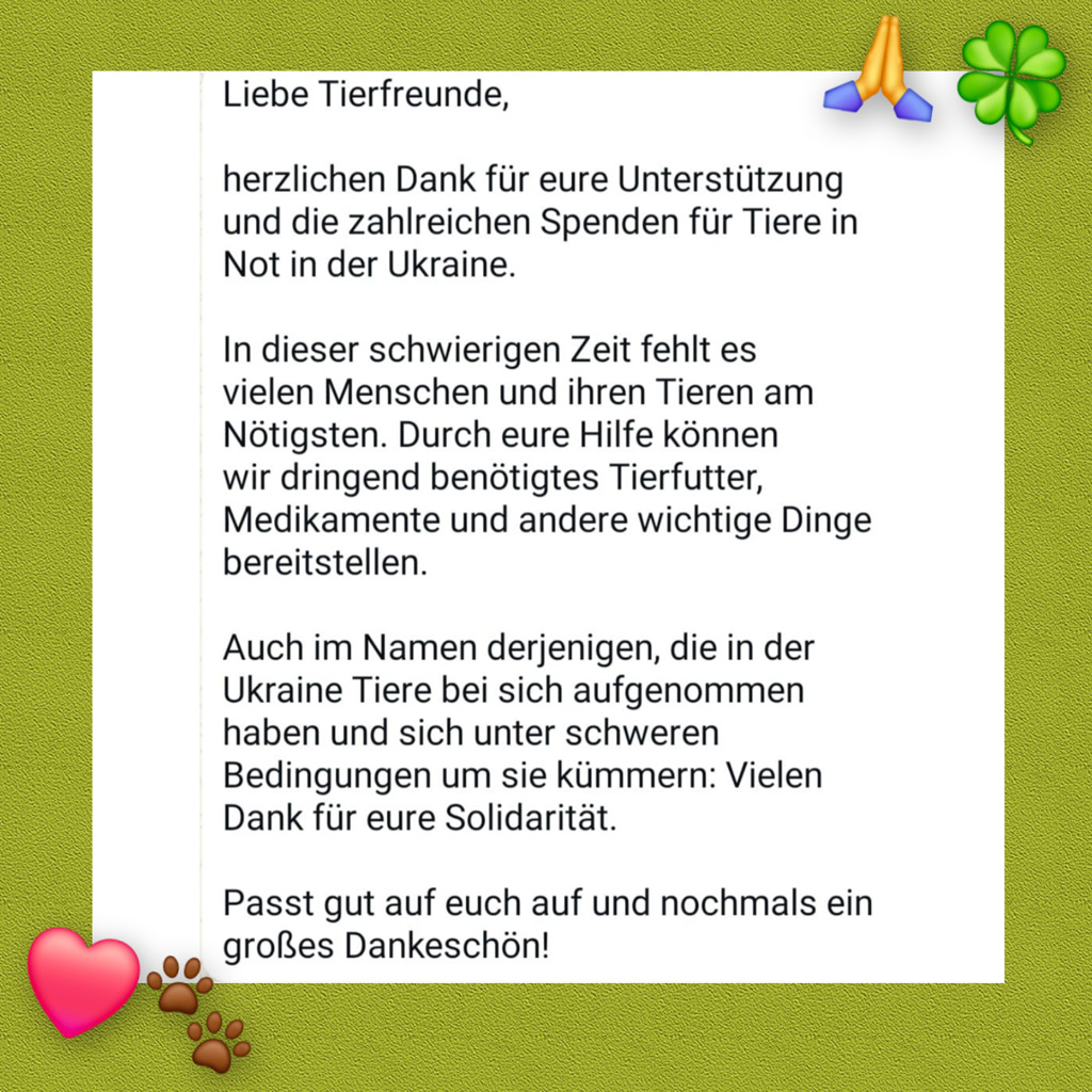 Der Spendenaufruf für die Tierhilfe Ukraine hat weiterhin Bestand und wir würden uns sehr freuen, wenn noch einiges mehr an Spenden für die Tiere in der Ukraine zusammenkämen.